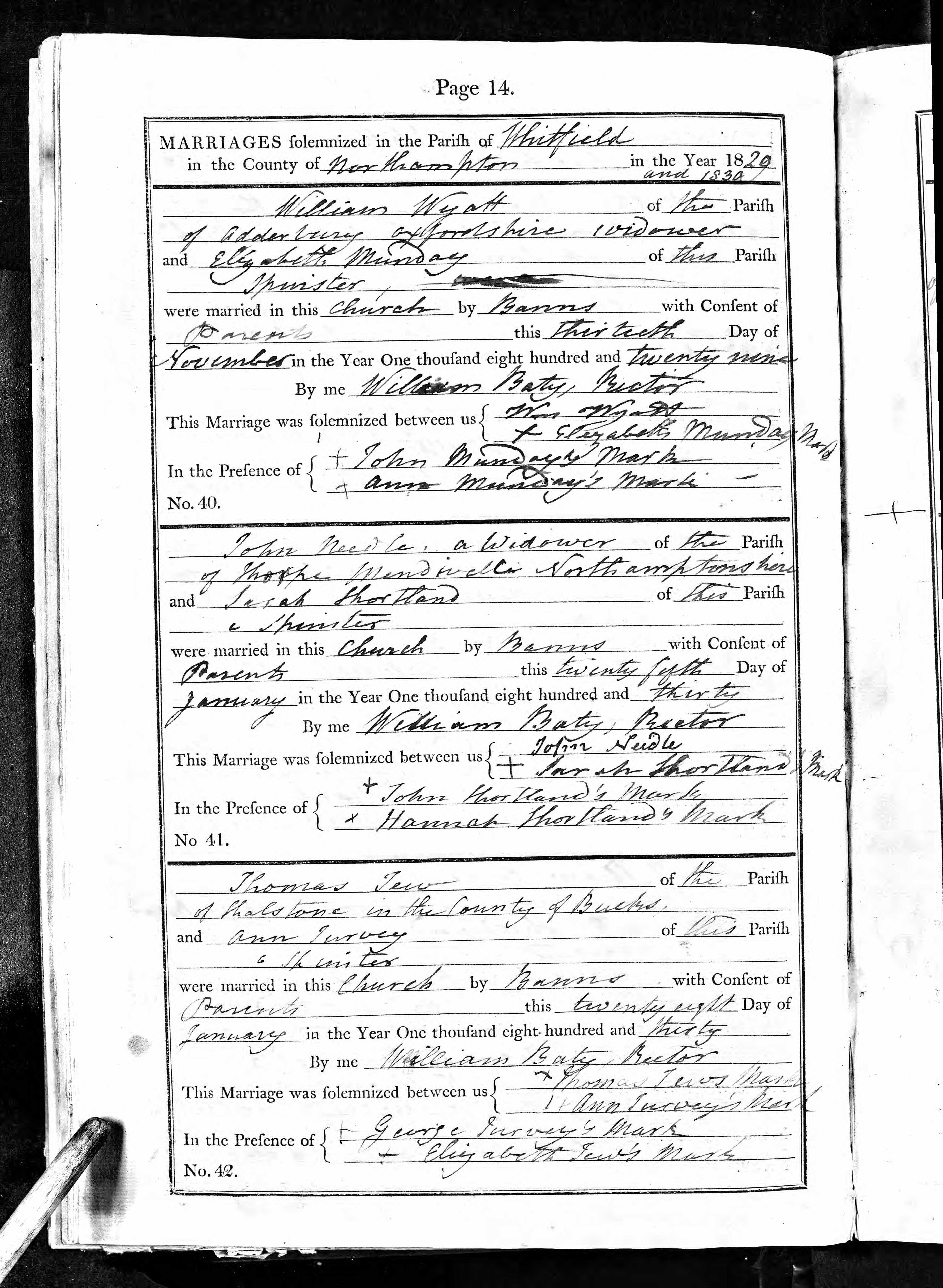 Parish Registers of St John the Evangelist, Whitfield, Northamptonshire; Marriage entry for Thomas Tew and Ann Turvey, 28 Jan 1830, Page 14, No 42.
