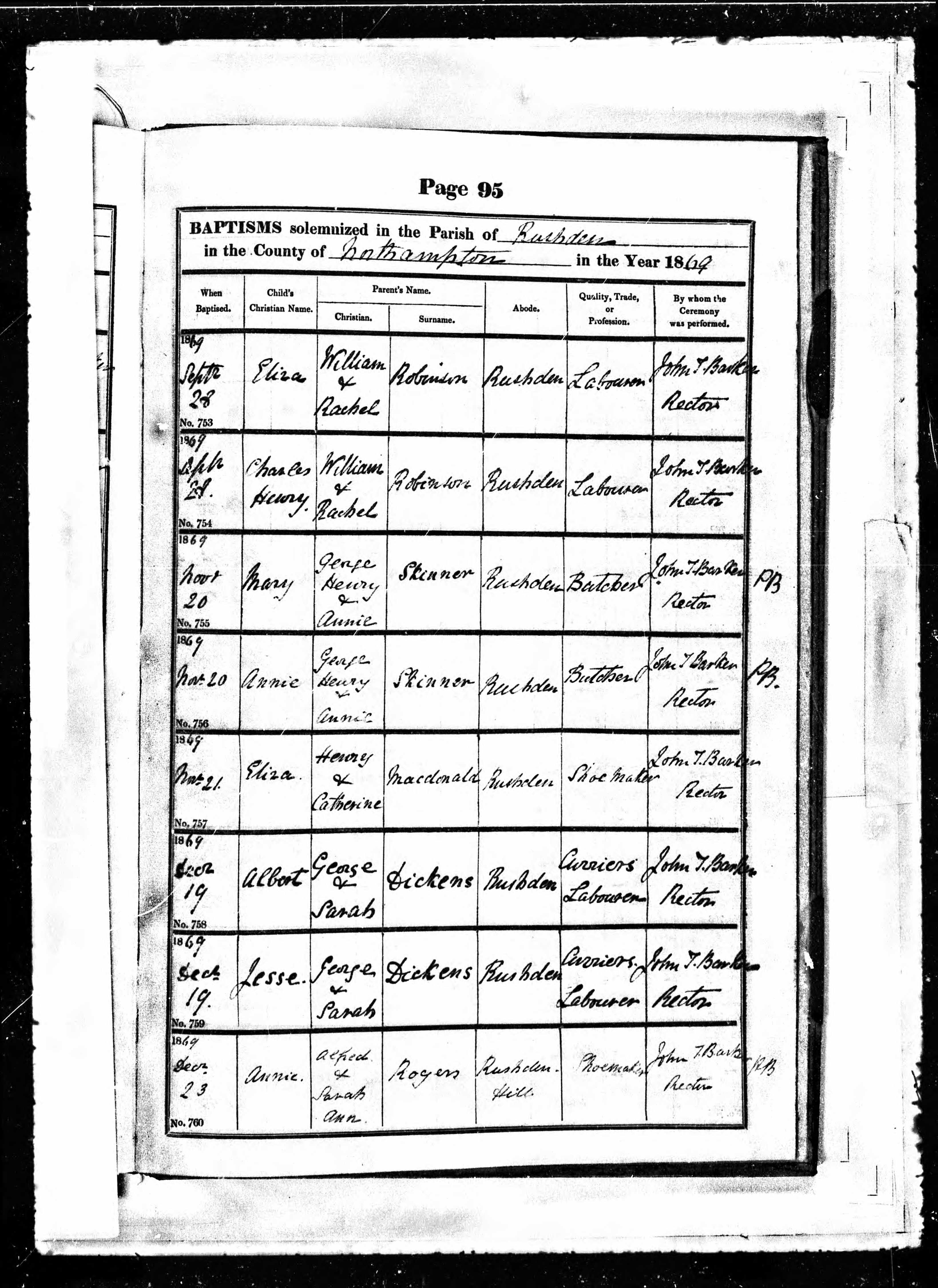 Parish Registers of St Mary's, Rushden, Northamptonshire; Baptism entry for Annie Rogers, 23 Dec 1869, Page 95, No 760.