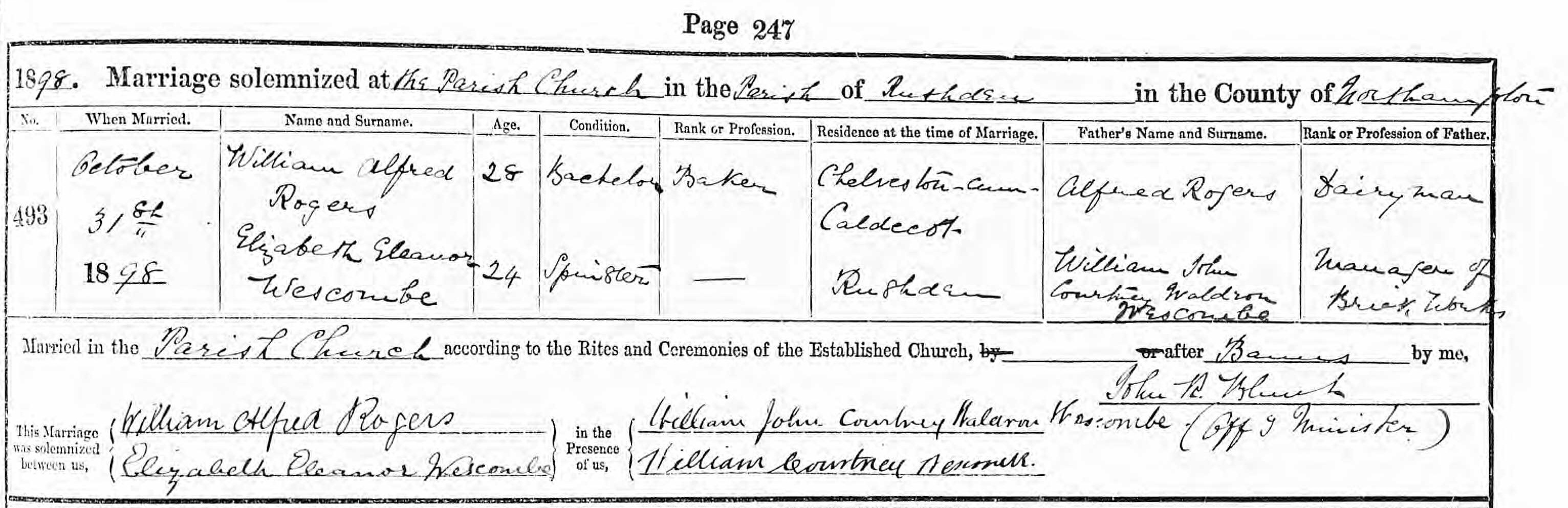 Parish Registers of St Mary's, Rushden, Northamptonshire; Marriage entry for William Alfred Rogers and Elizabeth Eleanor Wescombe, 31 Oct 1898, Page 247, No 493.