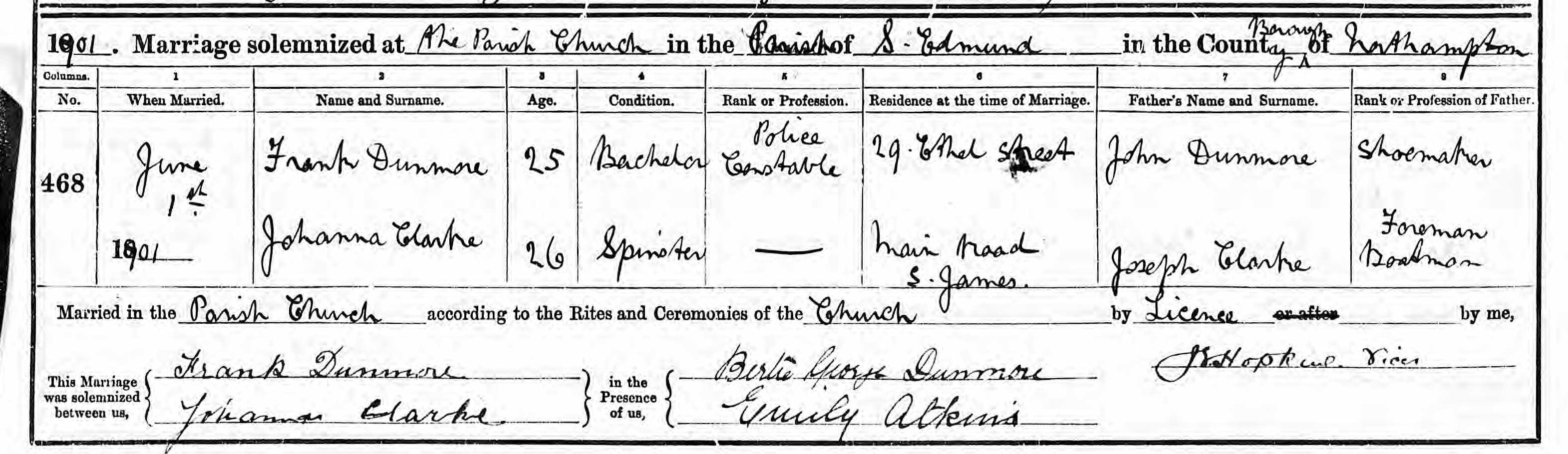 Parish Registers of St. Edmund, Northampton, Northamptonshire; Marriage entry for Frank Dunmore and Johanna Clarke, 1 Jun 1901, No 468.