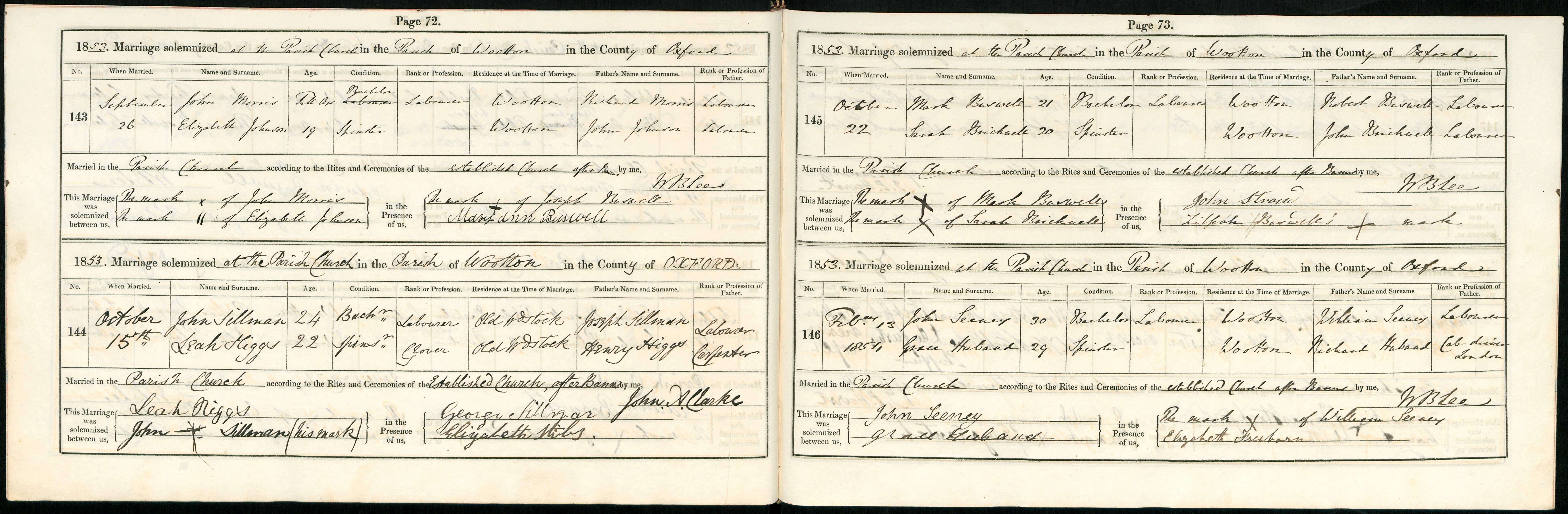 Parish Registers of St Peter, Wootton, Oxfordshire; Marriage entry for John Sillman and Leah Hiiggs, 15 Oct 1853, Page 72, No 144.