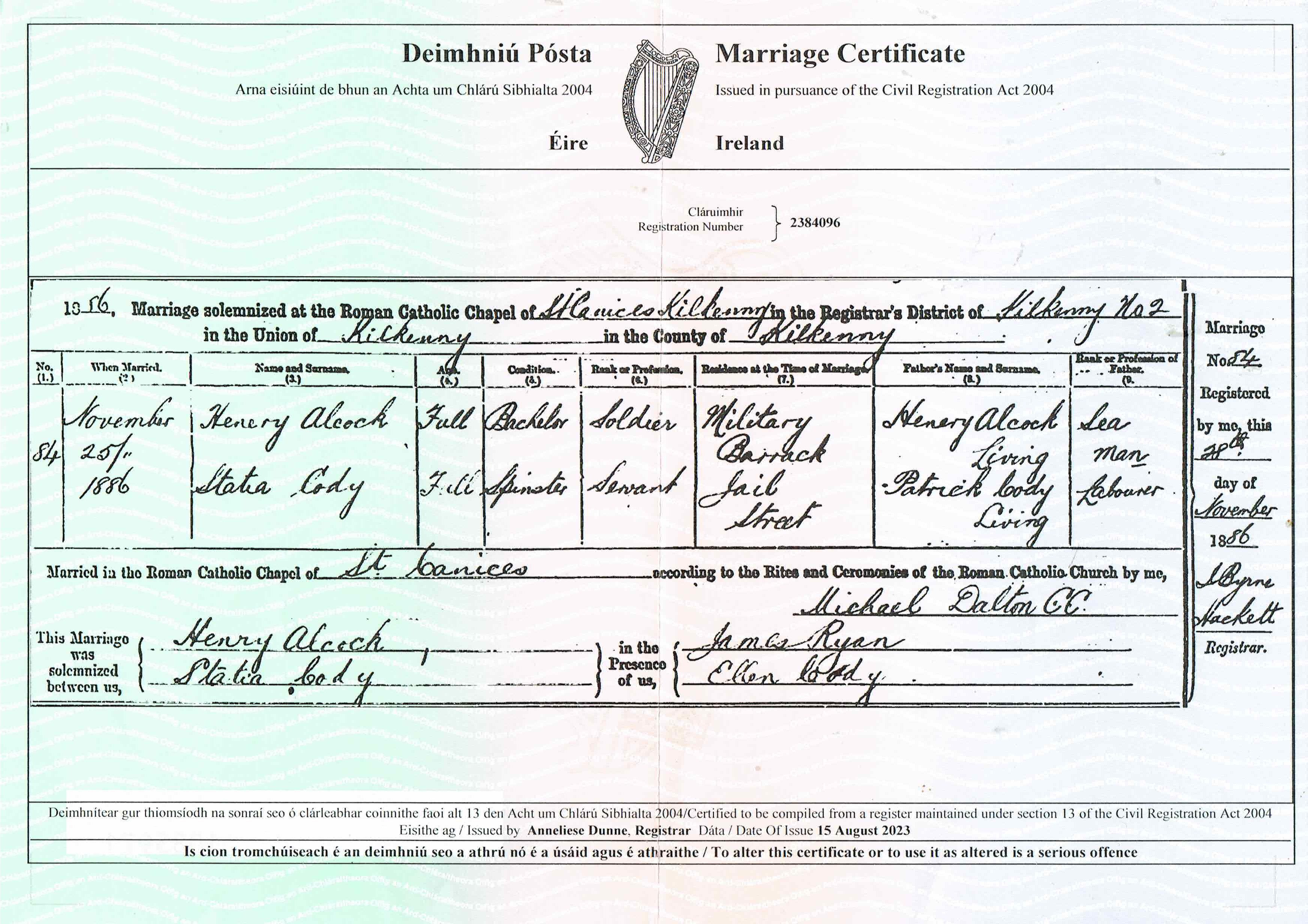 Marriage at The Roman Catholic Chapel of St Cannices, Kilkenny in the Registration District of Kilkenny No 2, district of Union of Kilkenny, Kilkenny, 1886, no. 84. Married 25 Nov 1886; Henery Alcock, age Full, condition Bachelor, occupation Soldier, residence Miltary Barrack and Statia Cody, age Full, condition Spinster, occupation Servant, residence Jail Street; groom's father Henery Alcock (living), Seaman; bride's father Patrick Cody (living), Labourer; married by according to the rites of the Roman Catholics; groom signed name, bride signed name; witnesses James Ryan (signed), Ellan Cody (signed)