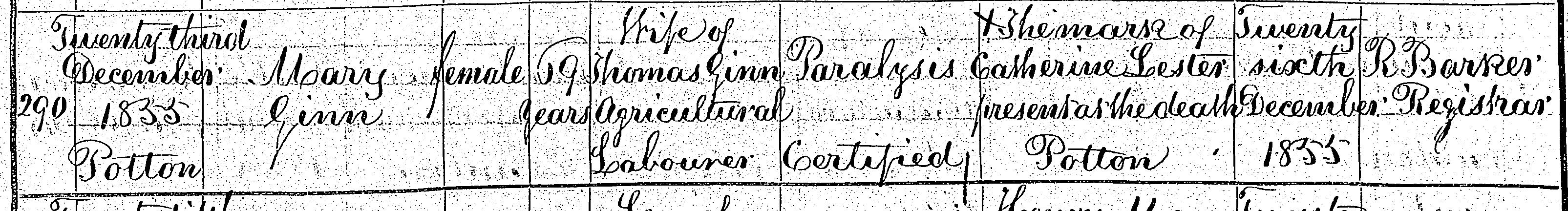 Death in the Registration District of Biggleswade, Bedfordshire, 1855, no. 290. Died 23 Dec 1855 at Potton; Mary Ginn; Female; age 69; Wife of Thomas Ginn, agricultural labourer. Cause of death: Paralysis; Certified. Informant was Catherine Lester (could not sign name); relation: Not known; residing at Potton; present at death. The death was registered 26 Dec 1855.