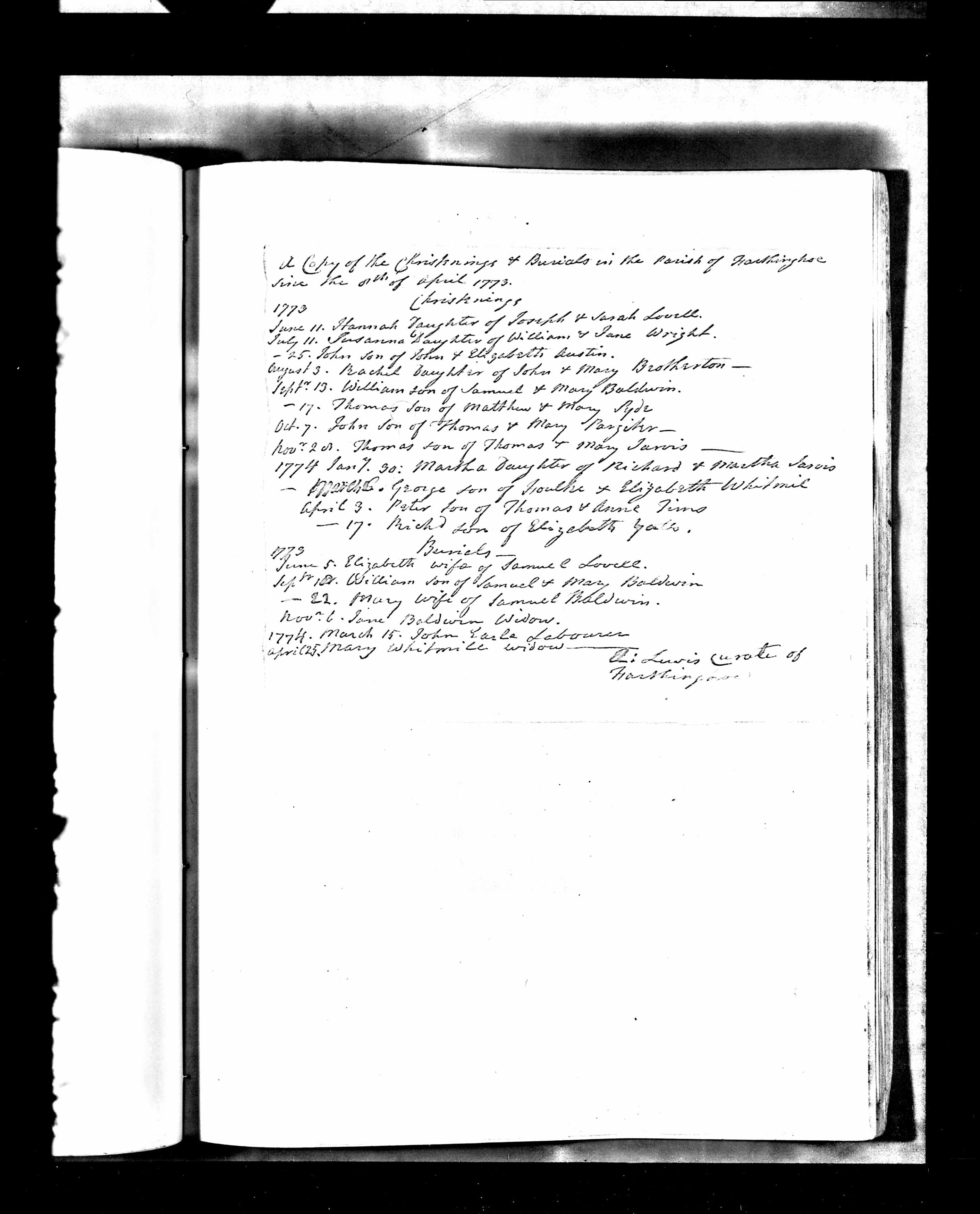 Bishop's Transcripts for the Diocese of Peterborough, England; Baptism entry for Thomas Jarvis, Farthinghoe, 2 Nov 1773.
