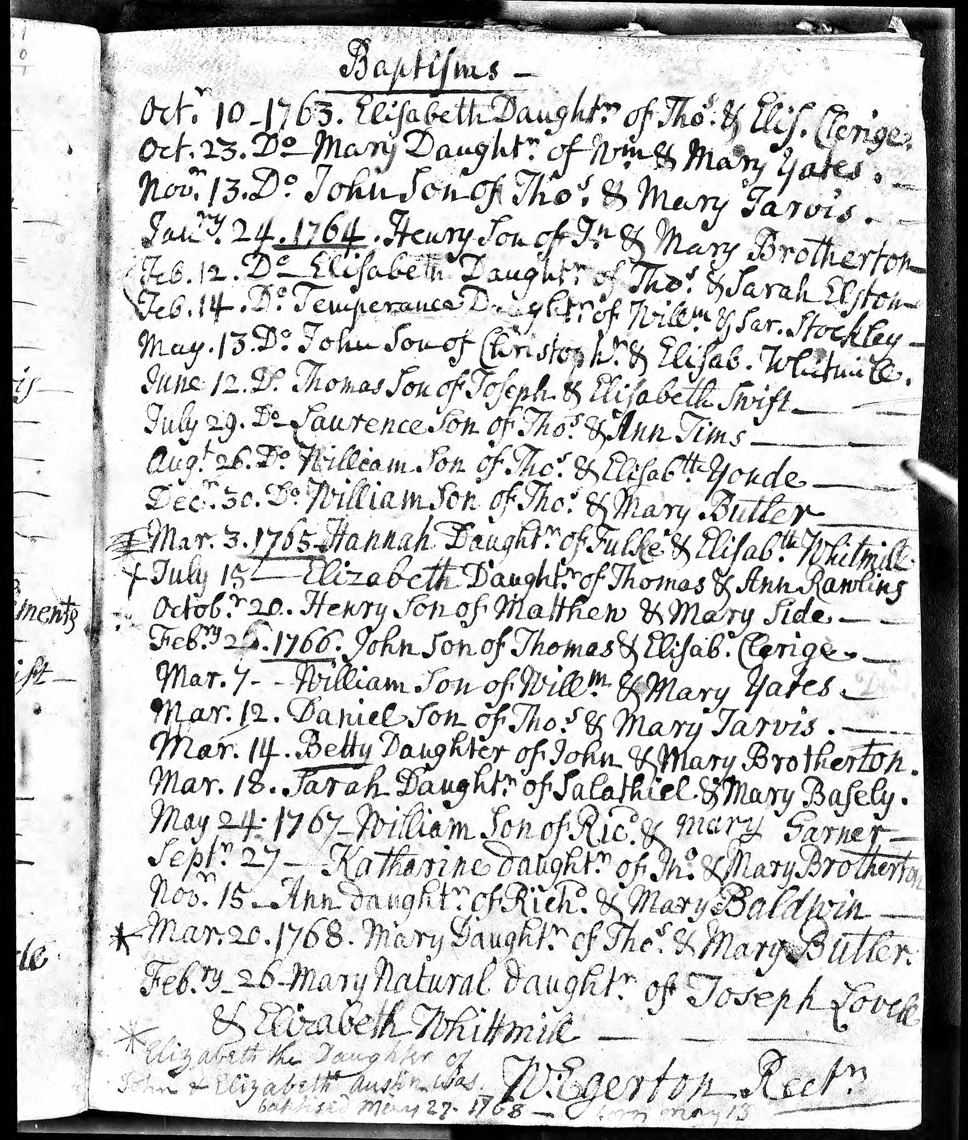 Parish Registers of St. Michael & All Saints, Farthinghoe, Northamptonshire; Baptism entry for John Jarvis, 13 Nov 1763.