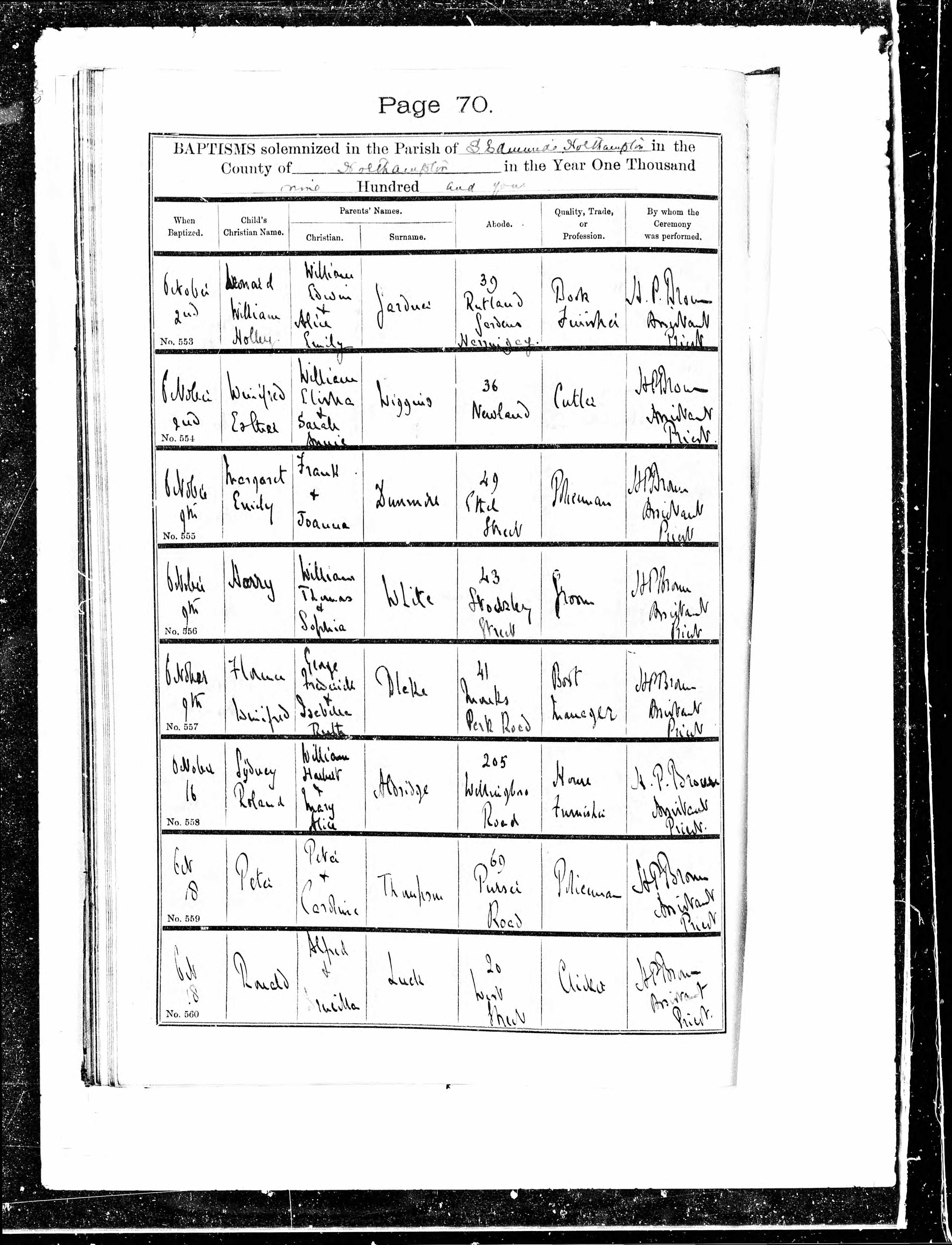 Parish Registers of St. Edmund, Northampton, Northamptonshire; Baptism entry for Margaret Emily Dunmore, 9 Oct 1904, Page 70, No 555.