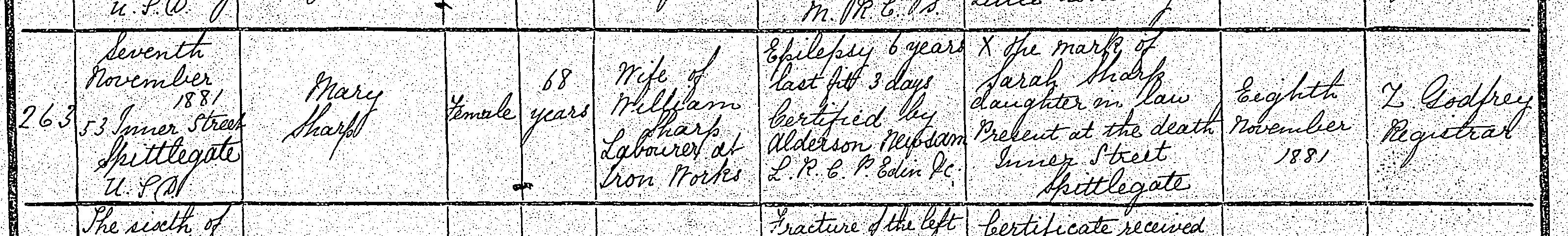 Death in the Registration District of Grantham, Lincolnshire, 1881, no. 263. Died 7 Nov 1881 at 53 Inner Street, Spittlegate; Mary Sharp; Female; age 68; Wife of William Sharp, Labourer at Iron Works. Cause of death: Epilepsy 6 years, last fit 3 days; certified. Informant was Sarah Sharp (could not sign name); relation: Daughter in Law; residing at Inner Street, Spittlegate; present at death. The death was registered 8 Nov 1881.