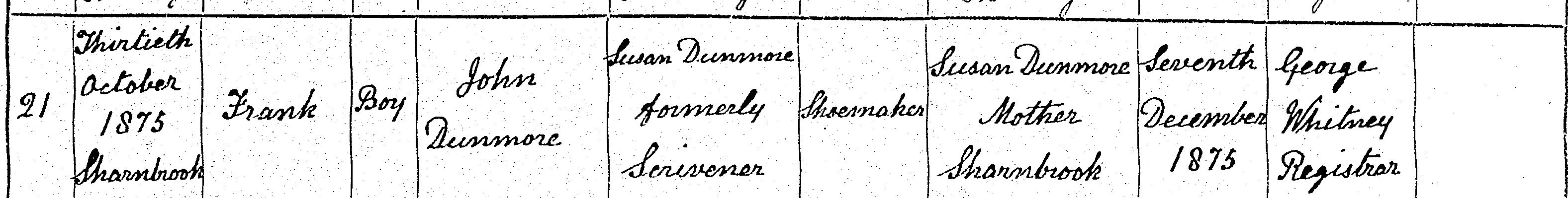 Birth in the Registration District of Bedford, Bedford, 1875, no. 21. Born 30 Oct 1875 at Sharnbrook; Frank Dunmore; Boy; father John Dunmore; mother Susan Dunmore formerly Scrivener. Occupation of father: Shoemaker. Informant was Susan Dunmore; Mother; Sharnbrook; signed name. The birth was registered 7 Dec 1875.