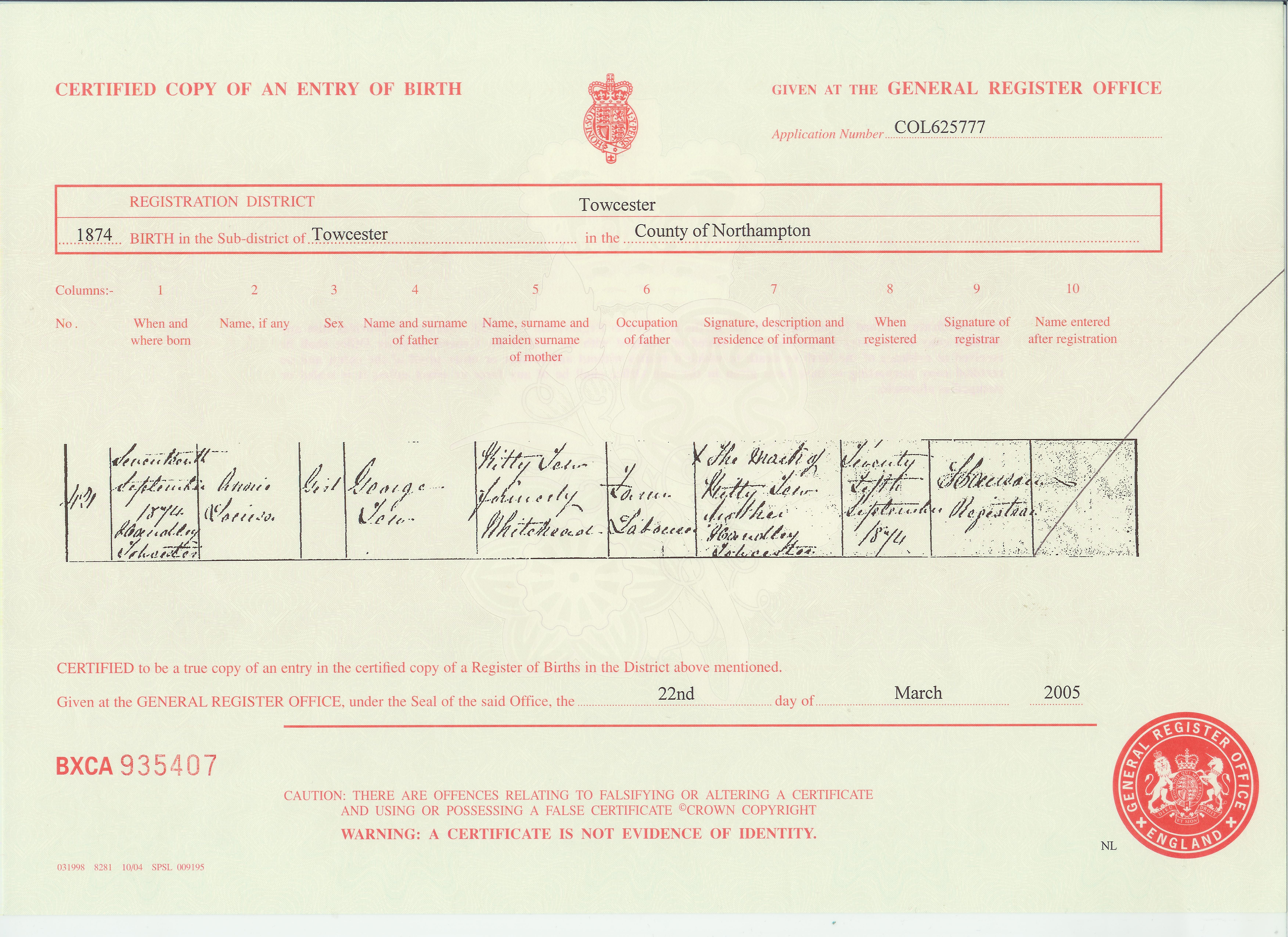 Birth in the Registration District of Towcester, Sub-district of Towcester, Northampton, 1874, no. 401. Born 17 Sep 1874 at Handley, Towcester; Annie Louisa Tew; Girl; father George Tew; mother Kitty Tew, formerly Whitehead. Occupation of father: Farm Labourer. Informant was Kitty Tew; Mother; Handley, Towcester; could not sign name. The birth was registered 25 Sep 1874.