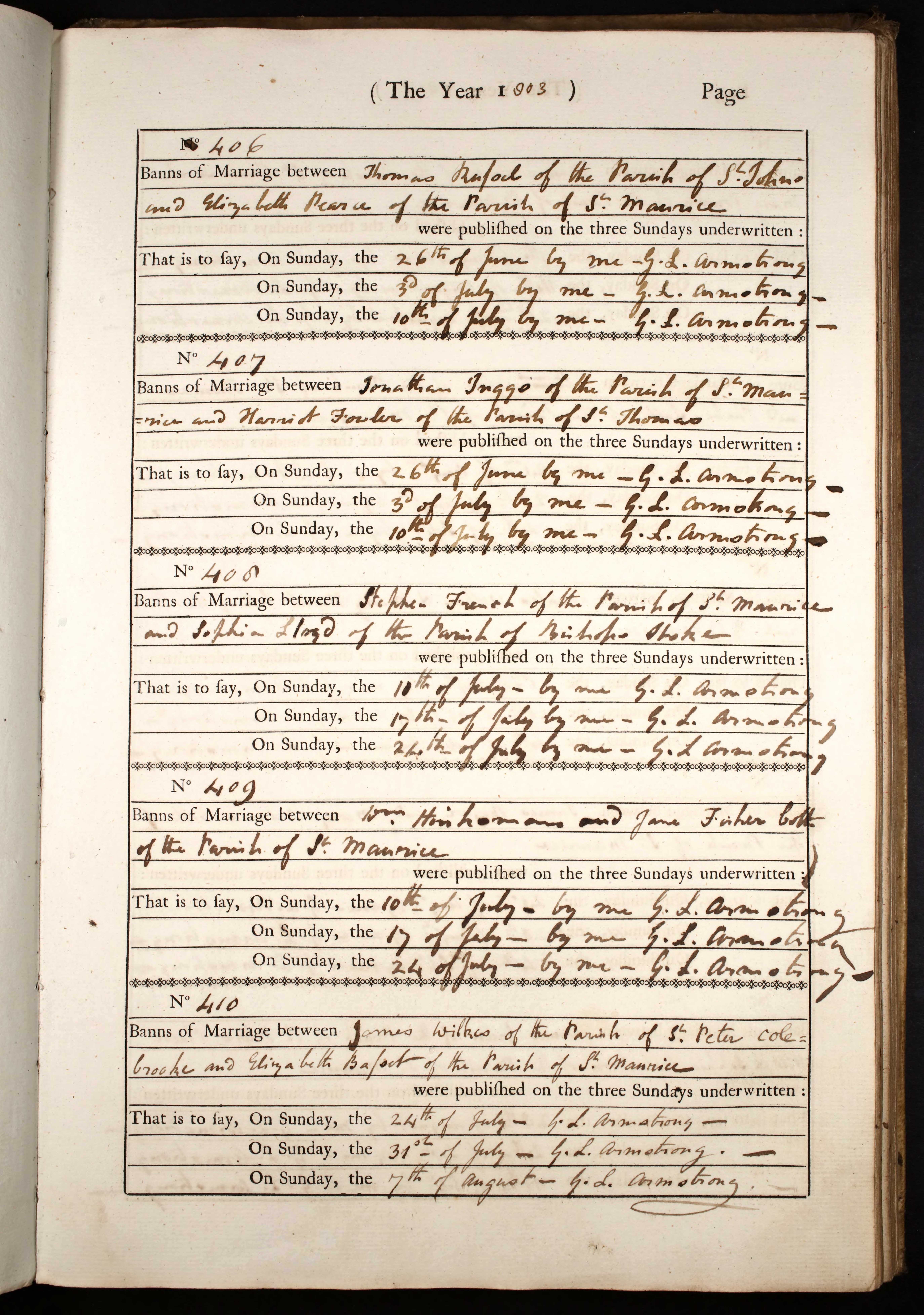 Parish Registers of St Maurice, Winchester St Maurice, Hampshire; Banns of marriage entry for Wm Hinksman and Jane Fisher, 10 Jul 1803, No 409.