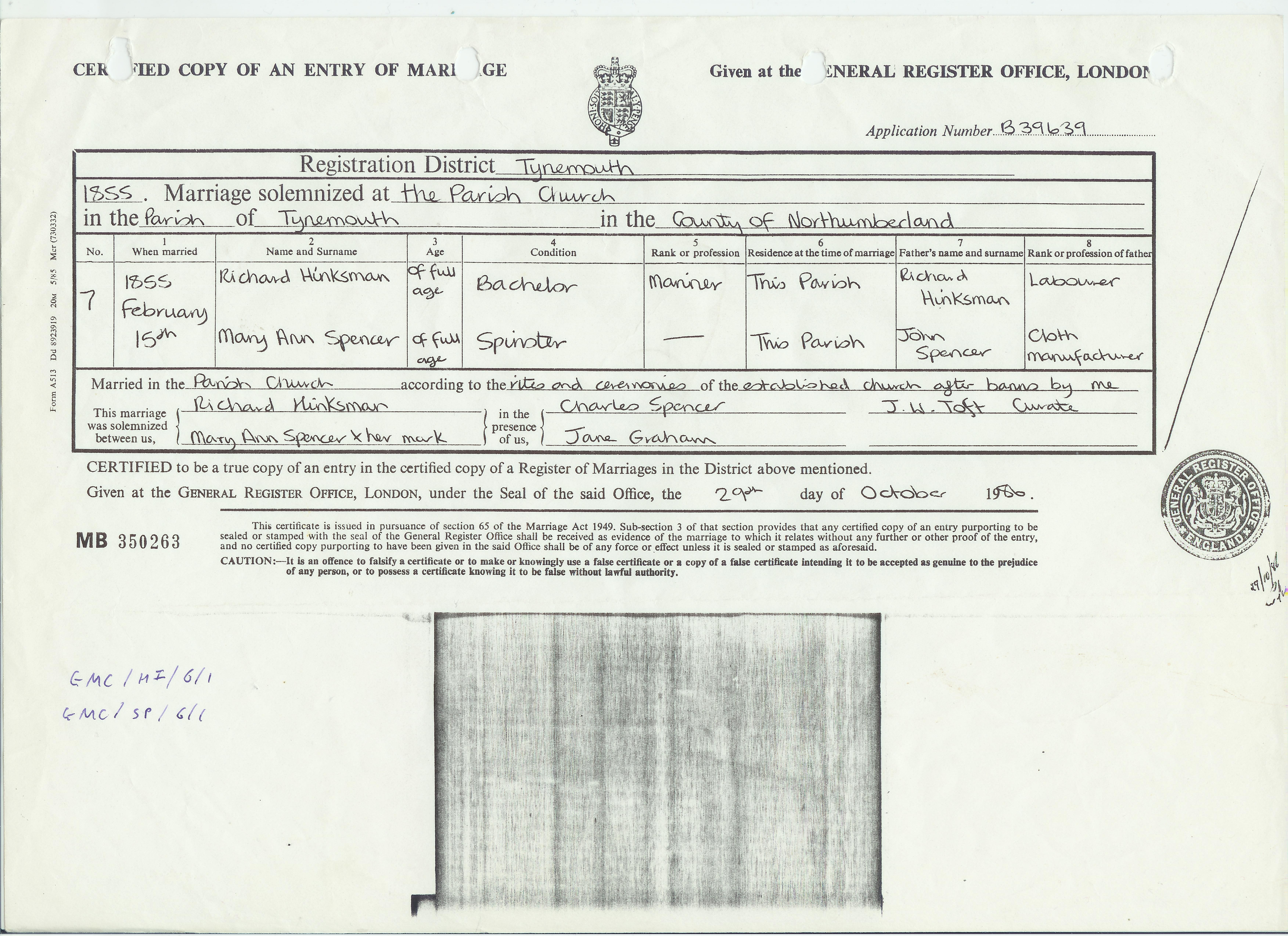 General Register Office of England and Wales; Marriage entry for Richard Hinksman and Mary Ann Spencer, Tynemouth, Jan-Mar Qtr 1855, Vol 10b, Page 231, No 7; Certified copy (transcribed) obtained 29 Oct 1986.