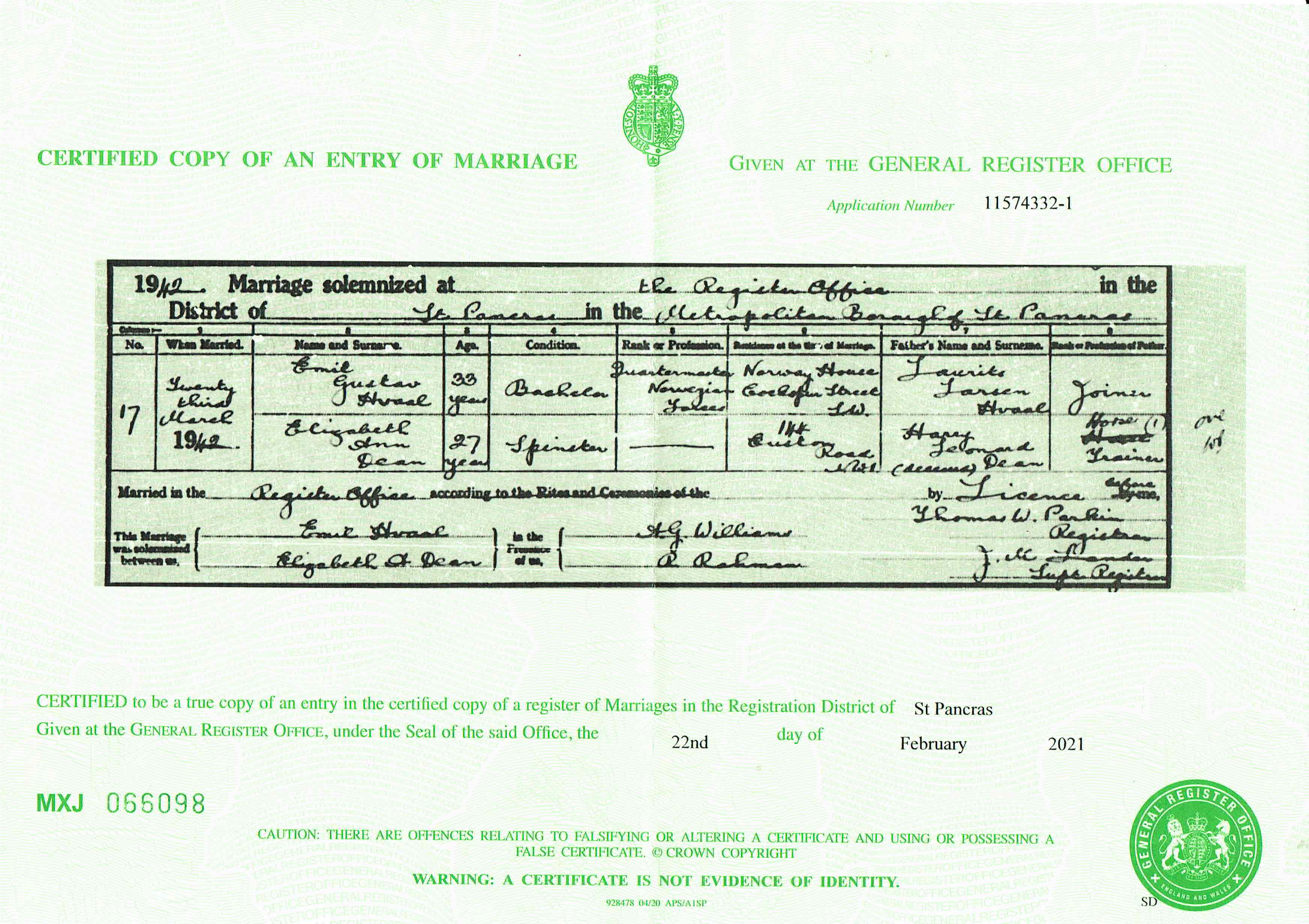 Marriage at The Register Office in the Registration District of St Pancras, district of District of St Pancras, London, 1942, no. 17. Married 23 Mar 1942; Emil Gustav Hvaal, age 33, condition Bachelor, occupation Quartermaster Norwegian Forces, residence Norway House, Cockspur Street and Elizabeth Ann Dean, age 27, condition Spinster, residence 144 Euston Road; groom's father Laurits Larsen Hvaal, Joiner; bride's father Harry Leonard Dean (Deceased), Horse trainer; married by Licence; groom signed name, bride signed name; witnesses A.G. Williams (signed), R [Robinson] (signed)