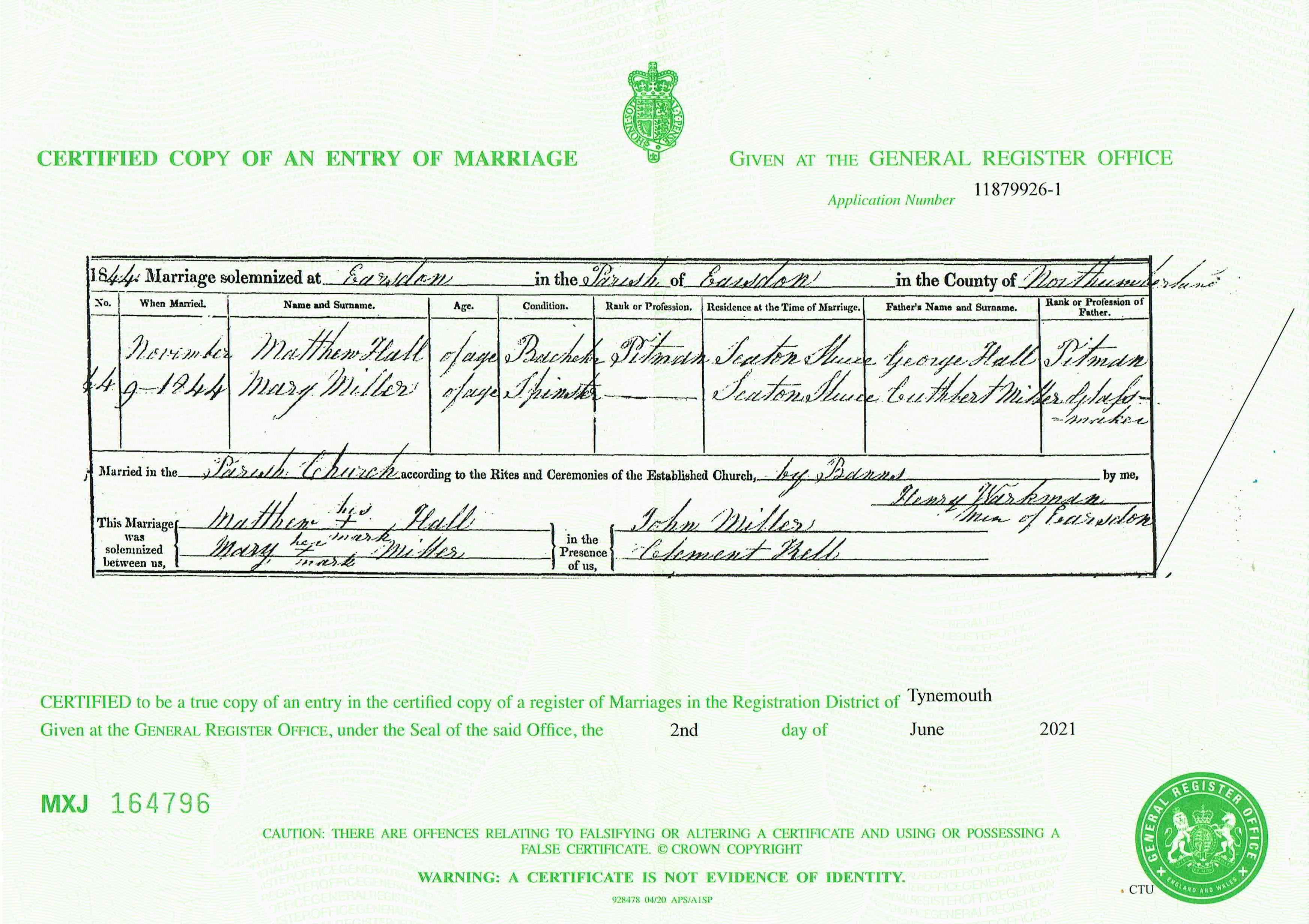 Marriage entry for Matthew Hall and Mary Miller, Tynemouth, Oct-Dec Qtr 1844, Vol 25, Page 471, No 64; Certified copy obtained 2 Jun 2021