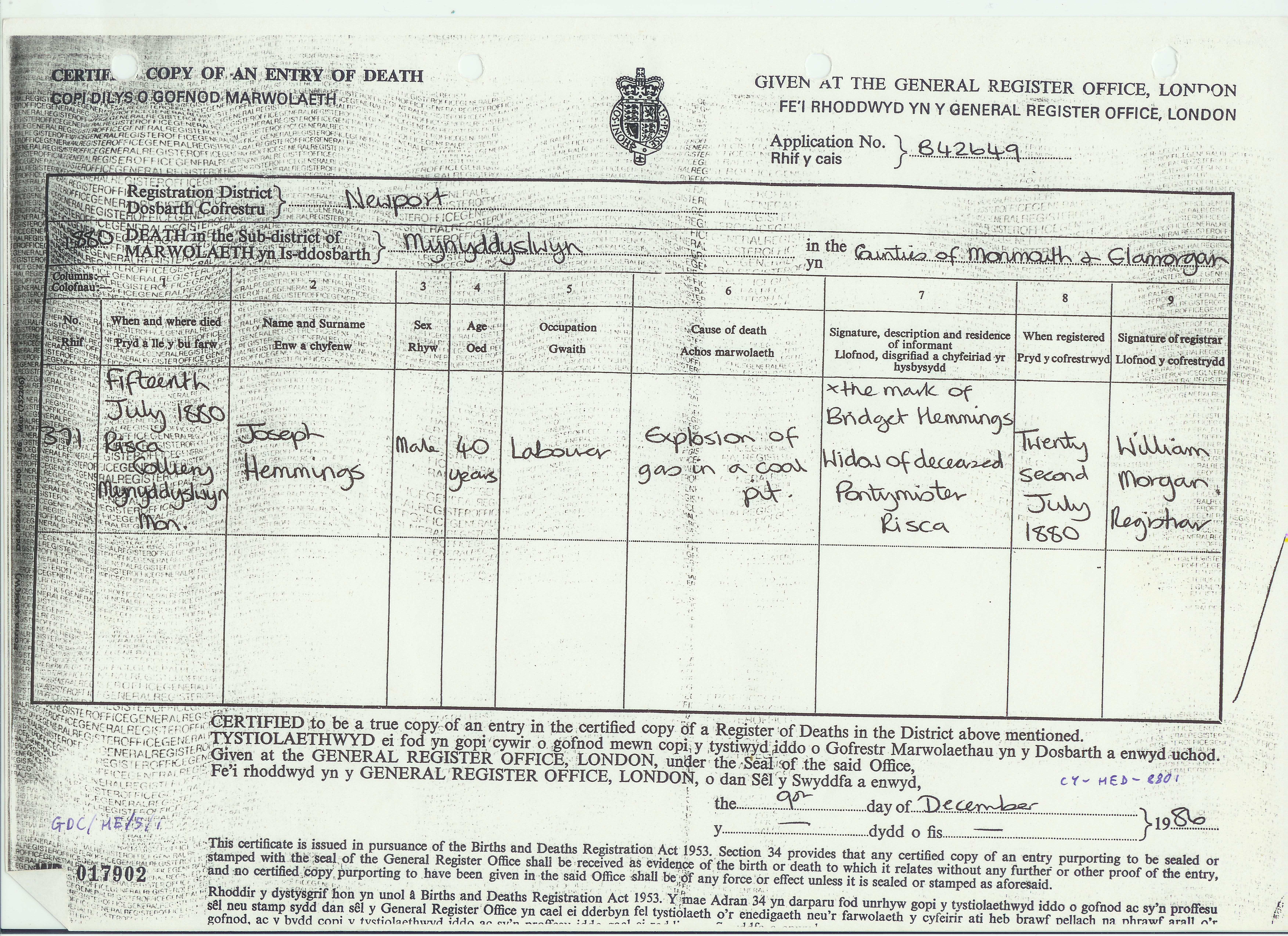 Death in the Registration District of Newport, Sub-district of Mynyddyslwyn, Monmouth and Glamorgan, 1880, no. 371. Died 15 Jul 1880 at Risca Colliery, Mynyddyslwyn, Mon.; Joseph Hemmings; Male; age 40; Labourer. Cause of death: Explosion of gas in a coal pit. Informant was Bridget Hemmings (could not sign name); relation: Wife; residing at Pontymister, Risca. The death was registered 22 Jul 1880.