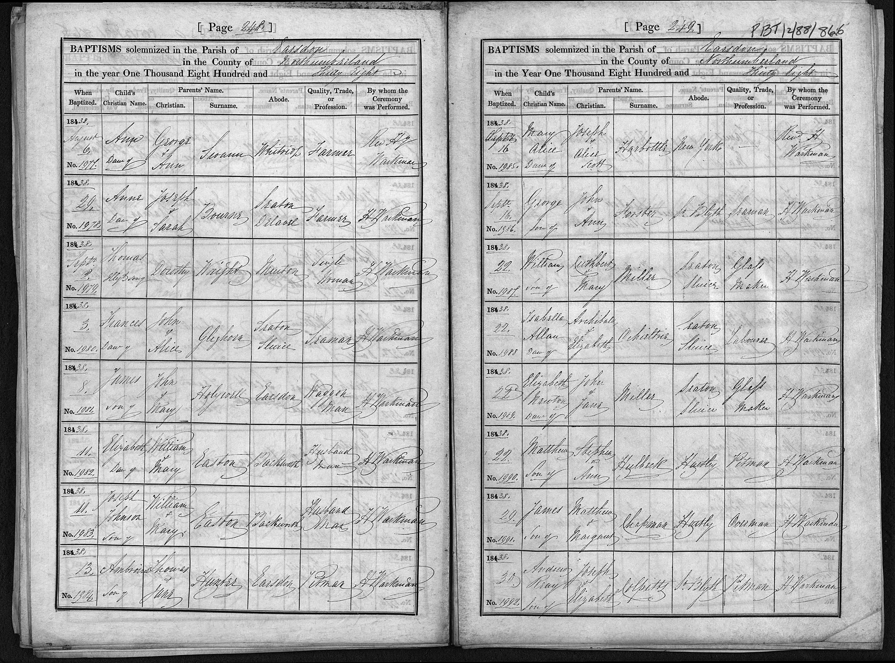 Baptism entry for William Miller, Earsdon, 22 Sep 1838, Page 249, No 1987