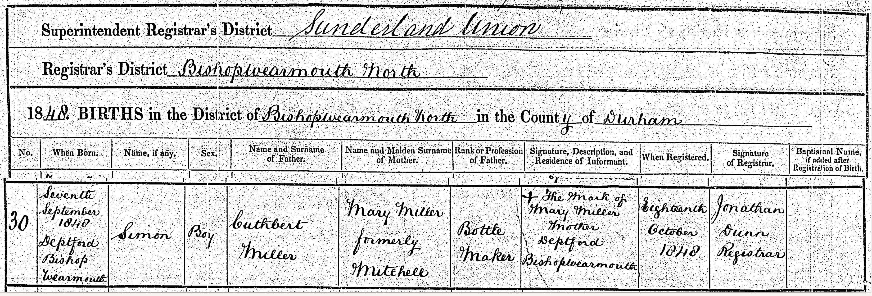Birth in the Registration District of Sunderland, Sub-district of Bishopwearmouth North, Durham, 1848, no. 30. Born 7 Sep 1848 at Deptford, Bishopwearmouth; Simon Miller; Boy; father Cuthbert Miller; mother Mary Miller formerly Mitchell. Occupation of father: Bottle maker. Informant was Mary Miller; Mother; Deptford, Bishopwearmouth; could not sign name. The birth was registered 18 Oct 1848.
