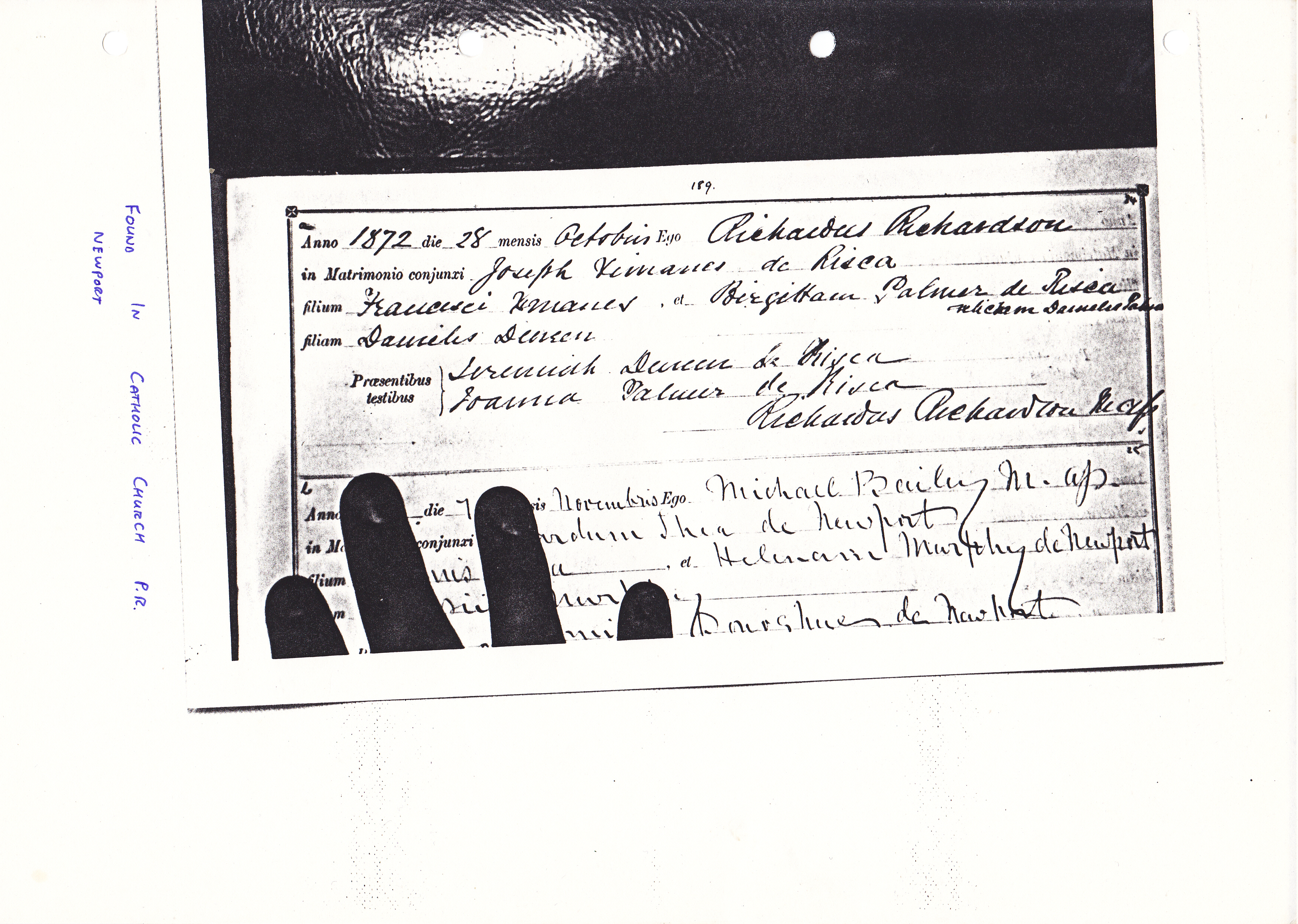 Anno 1872 die 28 mensis Octobris Ego Richardus Richardson in Matrimonio conjonxi Joseph Ximanes de Risca filium Francisci Ximanes et Brigittaia Palmer de Risca relictem Danielis Palmer filiam Danielis Deneen. Presentibus Jeremiah Deneen de Risca, Joanna Palmer de risca In 1872, on the 28th of October, I, Richard Richardson, married Joseph Ximanes of Risca, son of Francis Ximanes and Brigittaia Palmer of Risca, former husband Daniel Palmer, daughter of Daniel Deneen. In the presence of Jeremiah Deneen of Risca, Joanna Palmer of Risca