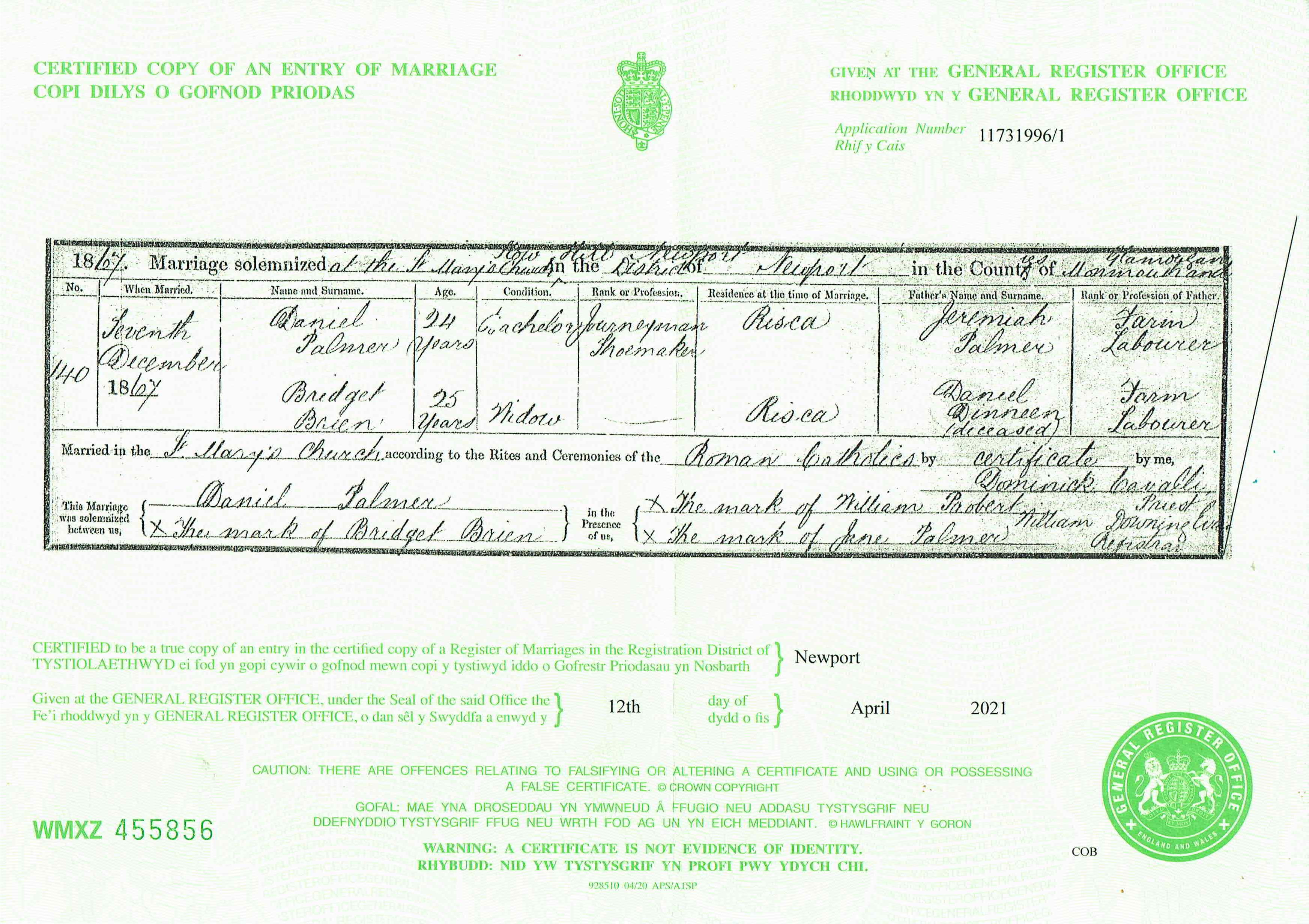 Marriage entry for Daniel Palmer and Bridget Brien, Newport, Oct-Dec Qtr 1867, Vol 11A, Page 319, No 140; Certified copy obtained 12 Apr 2021