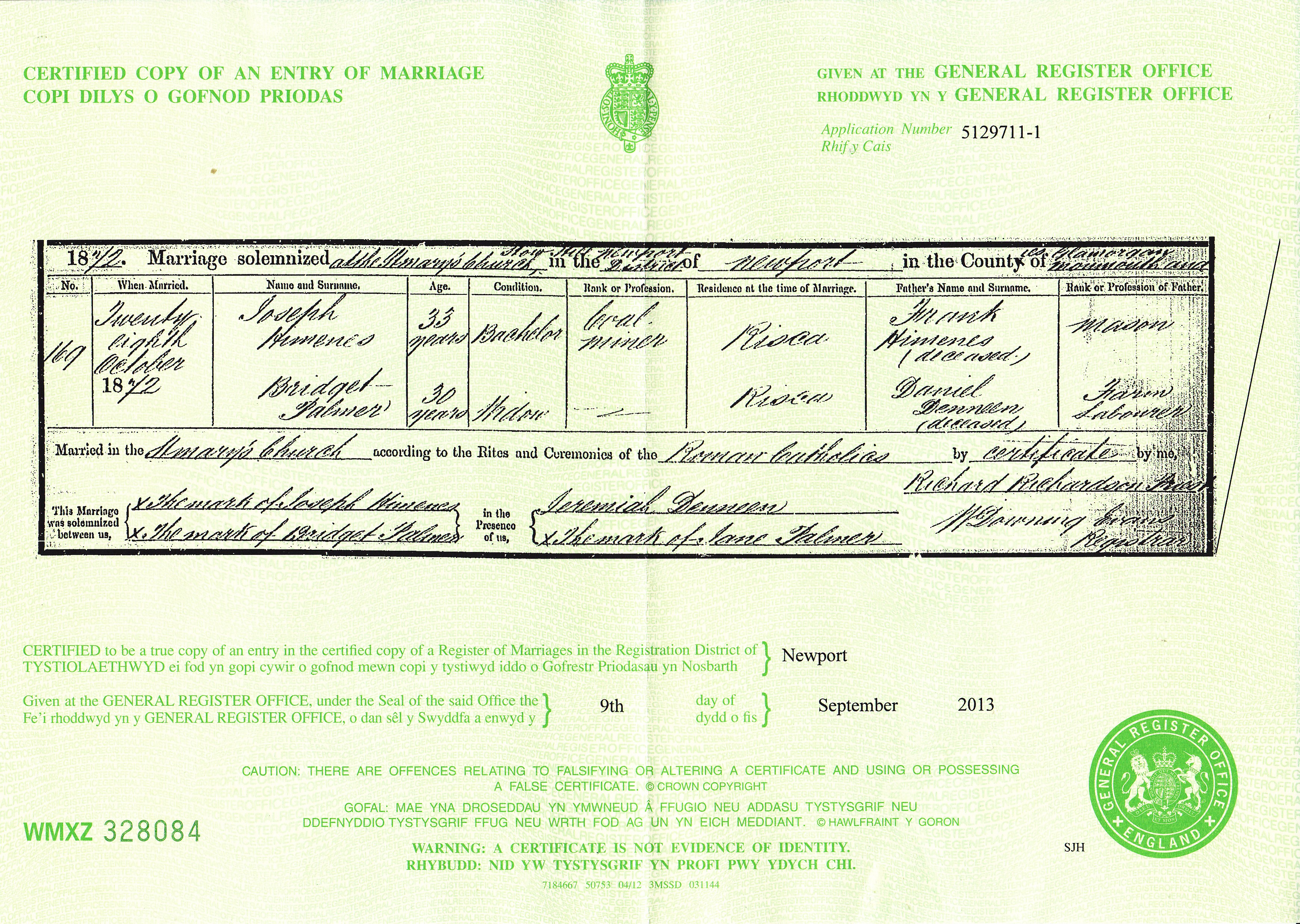 Marriage at St. Mary's Church, Stow Hill, Newport in the Registration District of Newport, district of District of Newport, Monmouth and Glamorgan, 1872, no. 169. Married 28 Oct 1872; Joseph Himenes, age 33, condition Bachelor, occupation Coal miner, residence Risca and Bridget Palmer, age 30, condition Widow, residence Risca; groom's father Frank Himenes (deceased), Mason; bride's father Daniel Denneen (deceased), Farm Labourer; married by Certificate according to the rites of the Roman Catholics; groom could not sign name, bride could not sign name; witnesses Jeremiah Deneen (signed), Jane Palmer (did not sign