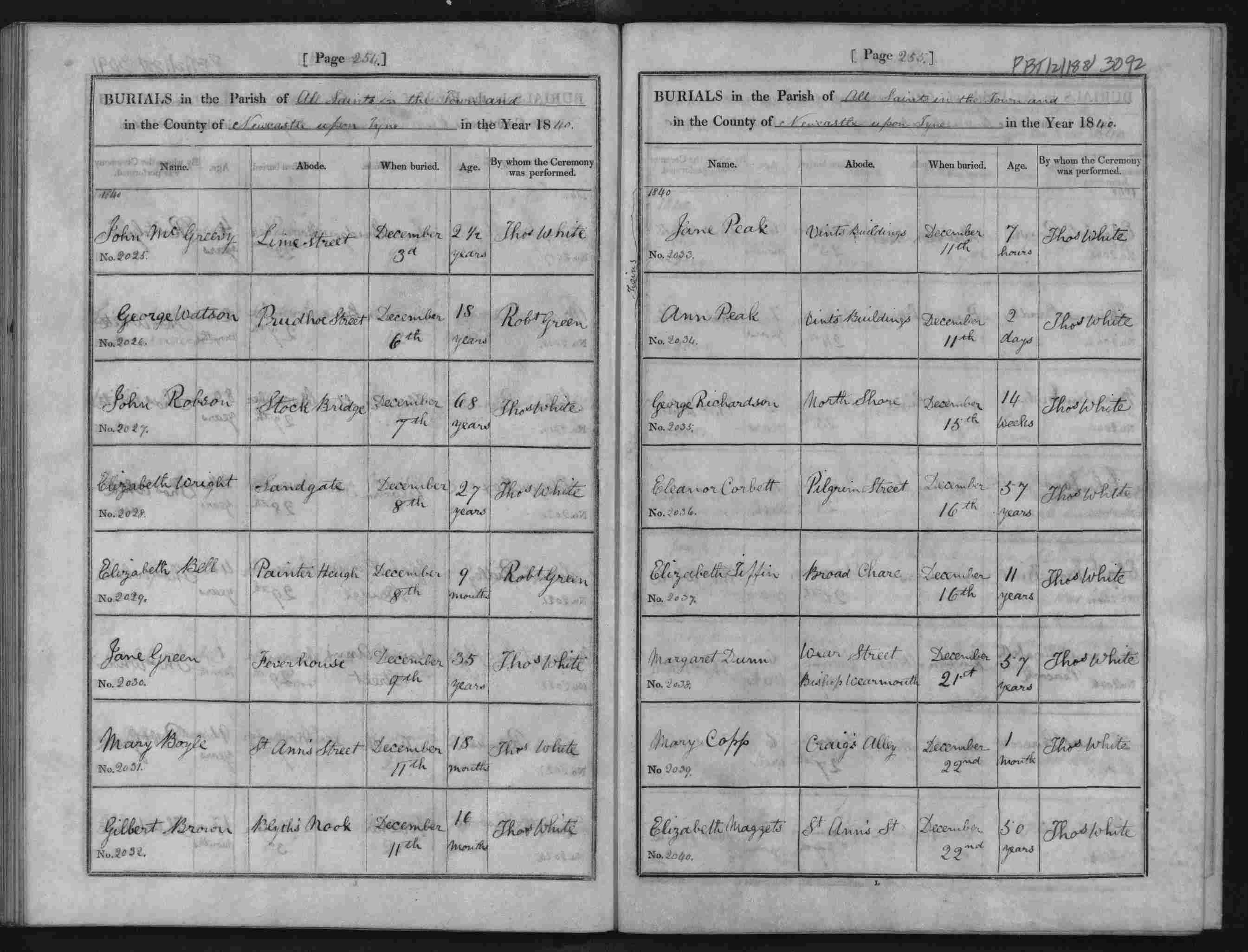 Bishop's Transcripts for the Diocese of Durham, England; Burial entry for Jane Peak, Newcastle All Saints, 11 Dec 1840m Page 255, No 2033.