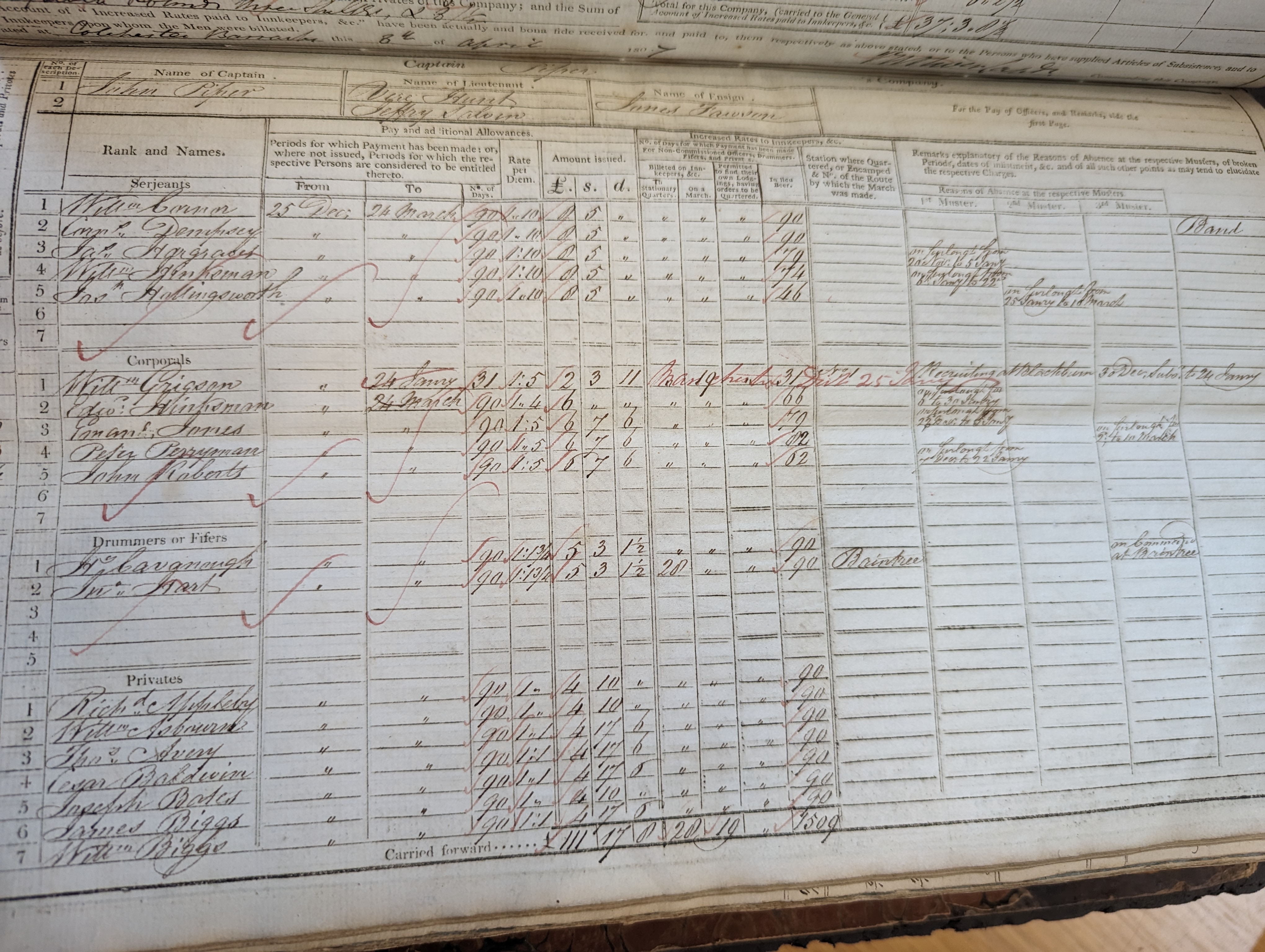 William Hinksman, sergeant in Captain Piper’s company, paid 25 Dec to 24 Mar, 90 days. Remarks: “On furlough from 6 Jan to 22 Jan”.