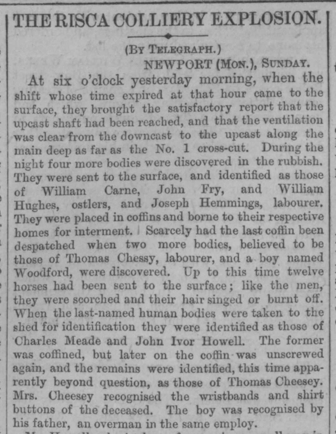 THE RISCA COLLIERY EXPLOSION. (BY TELEGRAPH.) NEWPORT (MON.), SUNDAY. At six o'clock yesterday morning, when the shift whose time expired at that hour came to the surface, they brought the satisfactory report that the upcast shaft had been reached, and that the ventilation was clear from the downcast to the upcast along the main deep as far as the No. 1 cross-cut. During the night four more bodies were discovered in the rubbish. They were sent to the surface, and identified as those of William Carne, John Fry, and William Hughes, ostlers, and Joseph Hemmings, labourer. They were placed in coffins and borne to their respective homes for interment. Scarcely had the last coffin been despatched when two more bodies, believed to be those of Thomas Chessy, labourer, and a boy named Woodford, were discovered. Up to this time twelve horses had been sent to the surface; like the men, they were scorched and their hair singed or burnt off. When the last-named human bodies were taken to the shed for identification they were identified as those of Charles Meade and John Ivor Howell. The former was coffined, but later on the coffin was unscrewed again, and the remains were identified, this time appa- rently beyond question, as those of Thomas Cheesey. Mrs. Cheesey recognised the wristbands and shirt buttons of the deceased. The boy was recognised by his father, an overman in the same employ.